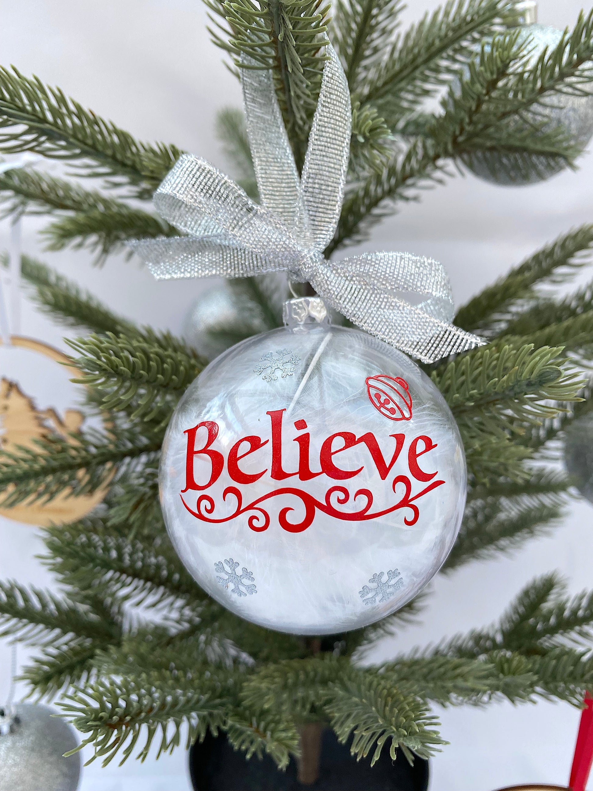 Each clear shatterproof bauble features soft floating feathers inside, paired with the word "Believe" in elegant script — a gentle reminder of Christmas magic, guardian angels, or loved ones watching over us during the holidays.