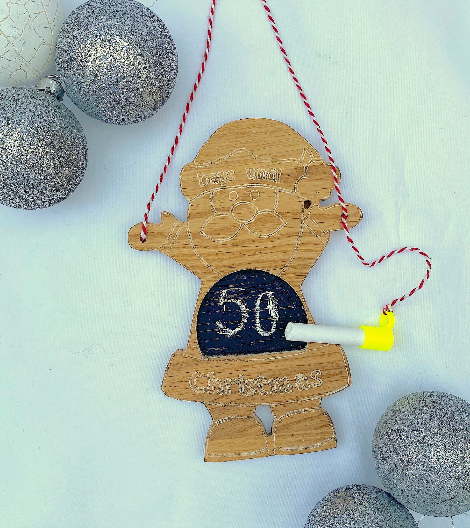 This reusable sign is a fun and festive way to count down the days until Santa arrives. With a Father Christmas design it also comes with the chalk. We recommend using a dry sponge, cloth or kitchen towel and its clean to keep counting.