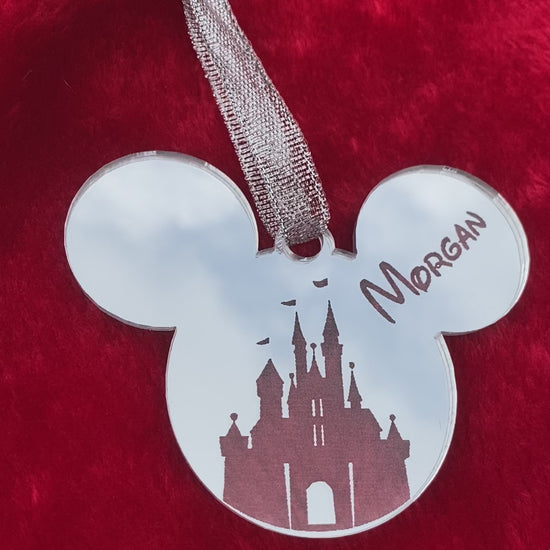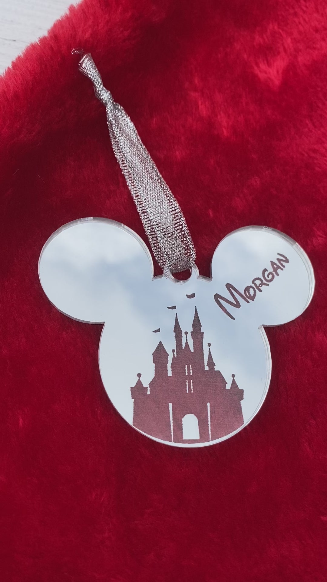 Bring a little magic to your Christmas tree with this Personalised mouse bauble. Crafted from premium silver mirrored acrylic and shaped like the a mouse with a castle engraving. This sparkly ornament is perfect for fans of all ages and makes a magical keepsake for first Christmases, family holidays, or theme park lovers.