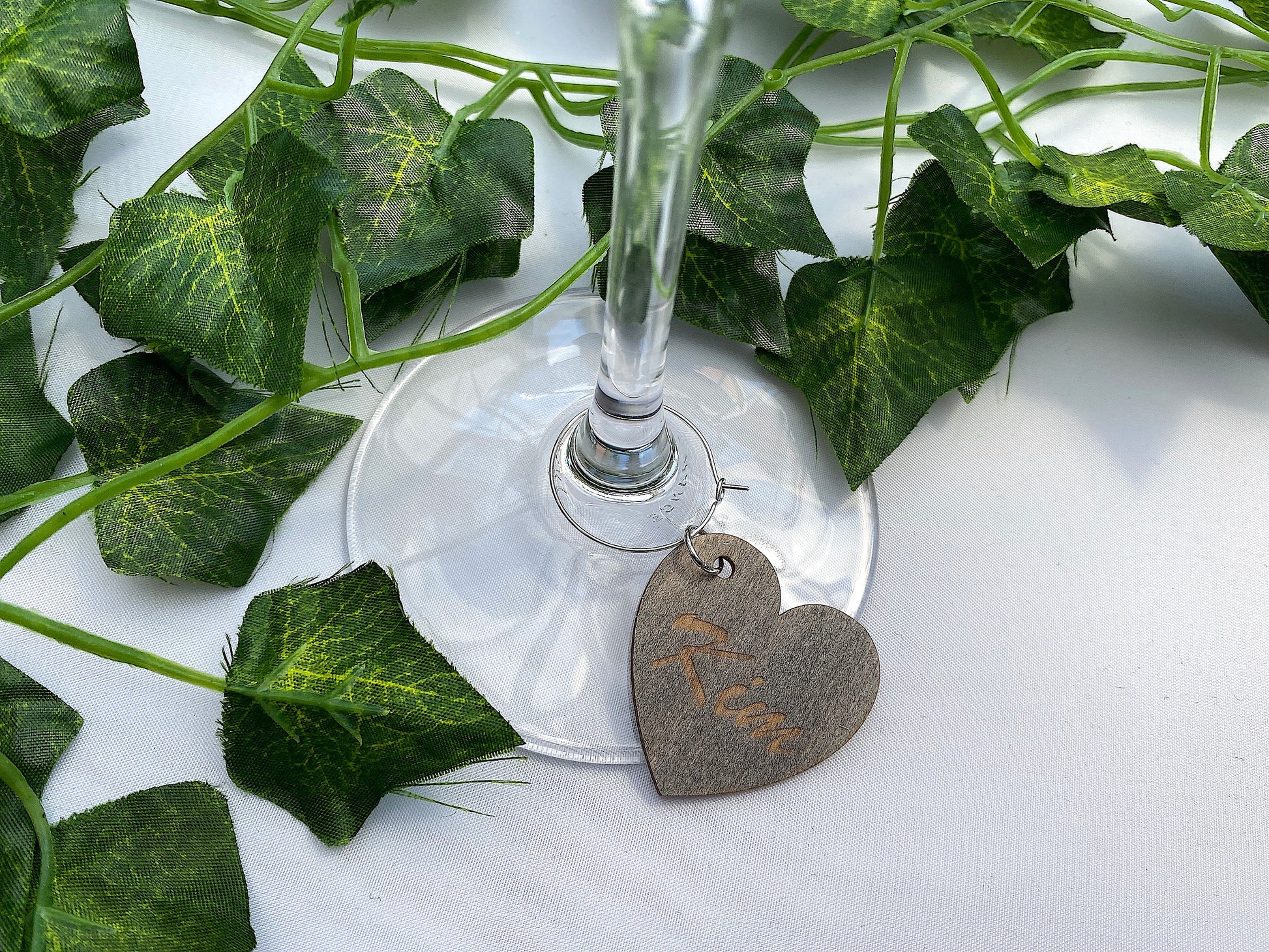 Our personalised wine glass charms are designed to clip easily around the stem of any wine glass, cocktail glass, or mug handle. Each charm features a shape and is engraved with a name, date or wedding party duties, making it easy to identify your drink at parties, gatherings, or quiet nights in.
