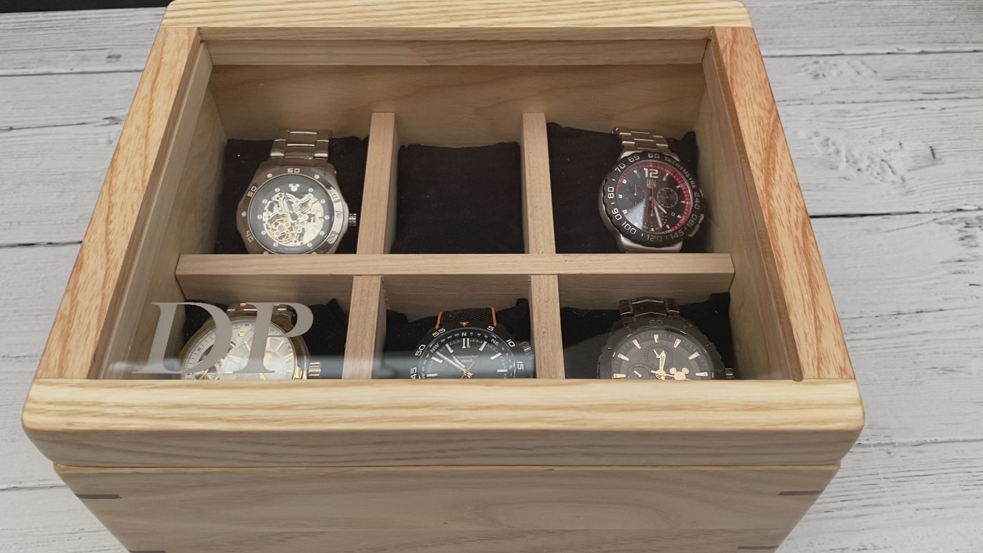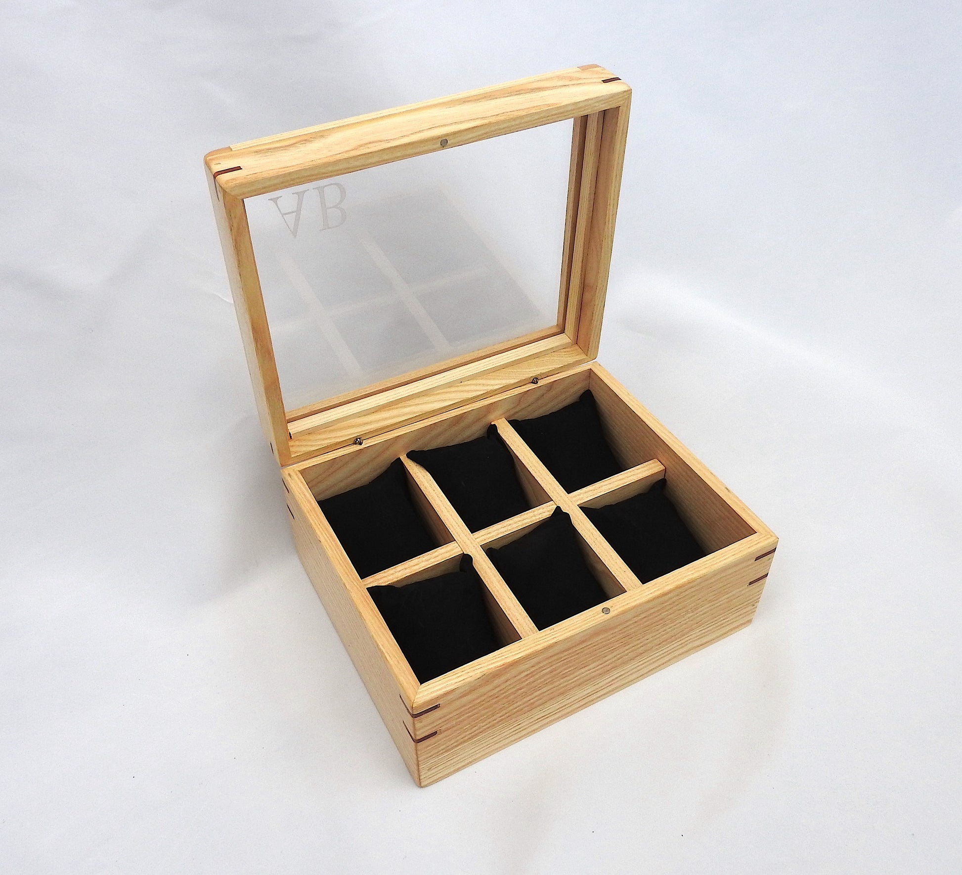 Made from solid ash wood with walnut pieces incorporated into the design. The engraved lid is magnetic and the magnets are imbedded into the base and lid to keep it secure while allowing you to open it freely. There are six soft pillows to hold watches or bracelets. A beautiful and elegant wooden watch case and also has a felt bottom on the inside and outside.