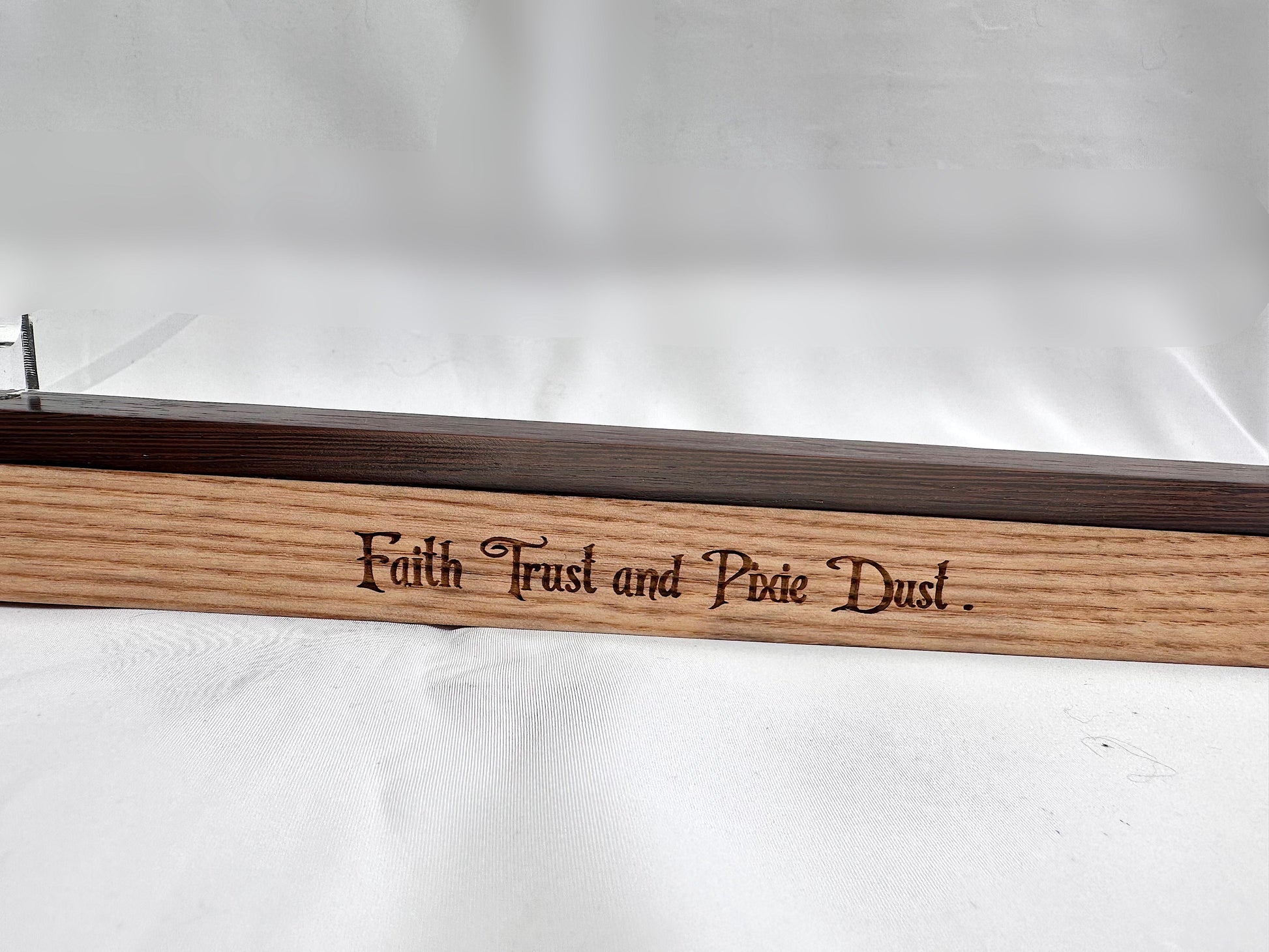 The standard engraving is "Faith, Trust and Pixie Dust" but these can also be personalised. Text can also been filled black.