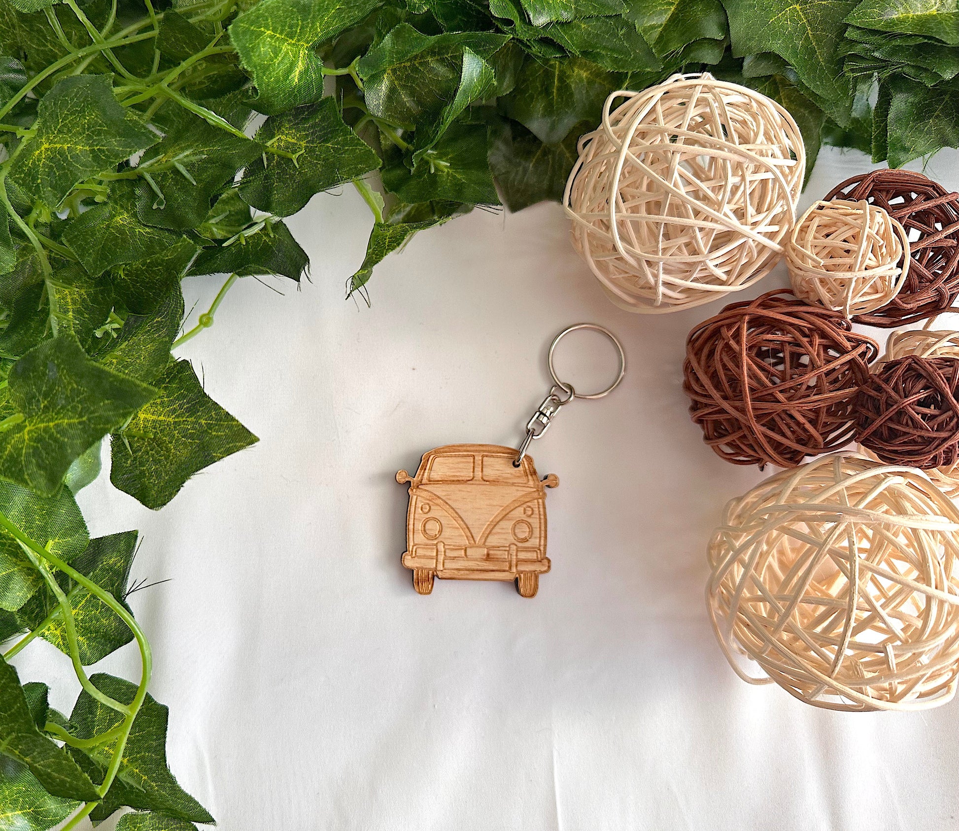 Embrace the spirit of adventure with our wooden camper van keyring. Perfect for travel enthusiasts, van-lifers, and lovers of retro design, this charming keychain is laser-cut from hardwood and shaped like a classic camper van.